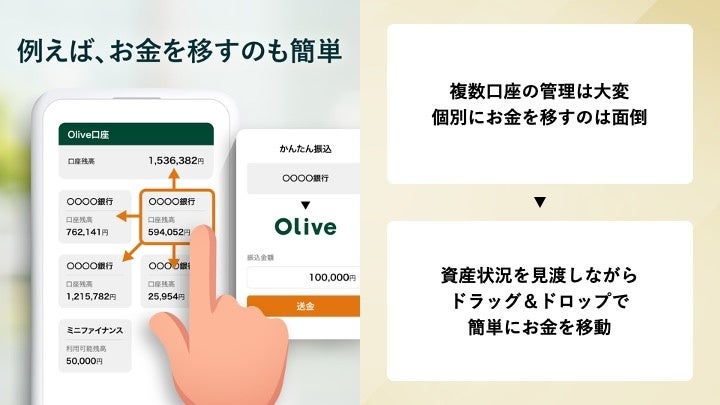 『マネーフォワード ME』と『Olive』の機能を掛け合わせ、シームレスな資金移動体験を提供。口座管理画面において様々な金融機関の口座残高を一覧で確認できることに加え、ドラッグ&ドロップなどの直感的な操作で金融機関をまたいだ資金移動までが実現できる。