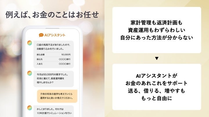 ユーザーの家計・資産の状況や、各種金融サービスの利用状況を分析し、一人ひとりにあったお金の使い方を提案するAIアシスタント機能。銀行、カード、証券などのカテゴリーやあらゆる制約を超えて、ユーザーが最適な形でお金を使うことができる体験を提供。