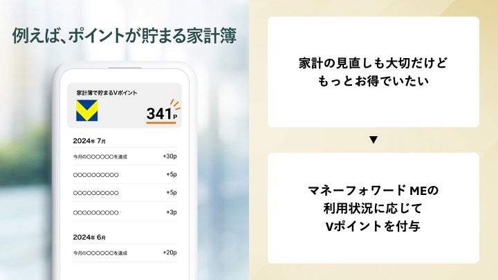 『マネーフォワード ME』の利用状況に応じて、『青と黄色のVポイント』がお得にたまる機能。家計の管理や見直しを、より一層楽しく、お得な体験にアップデートする。