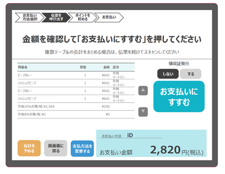 レストランや居酒屋などでの飲食後、お客様自身で会計伝票のバーコード情報をセルフレジで読み取り、カードやスマホ決済などのキャッシュレス支払いを簡単に行えます。