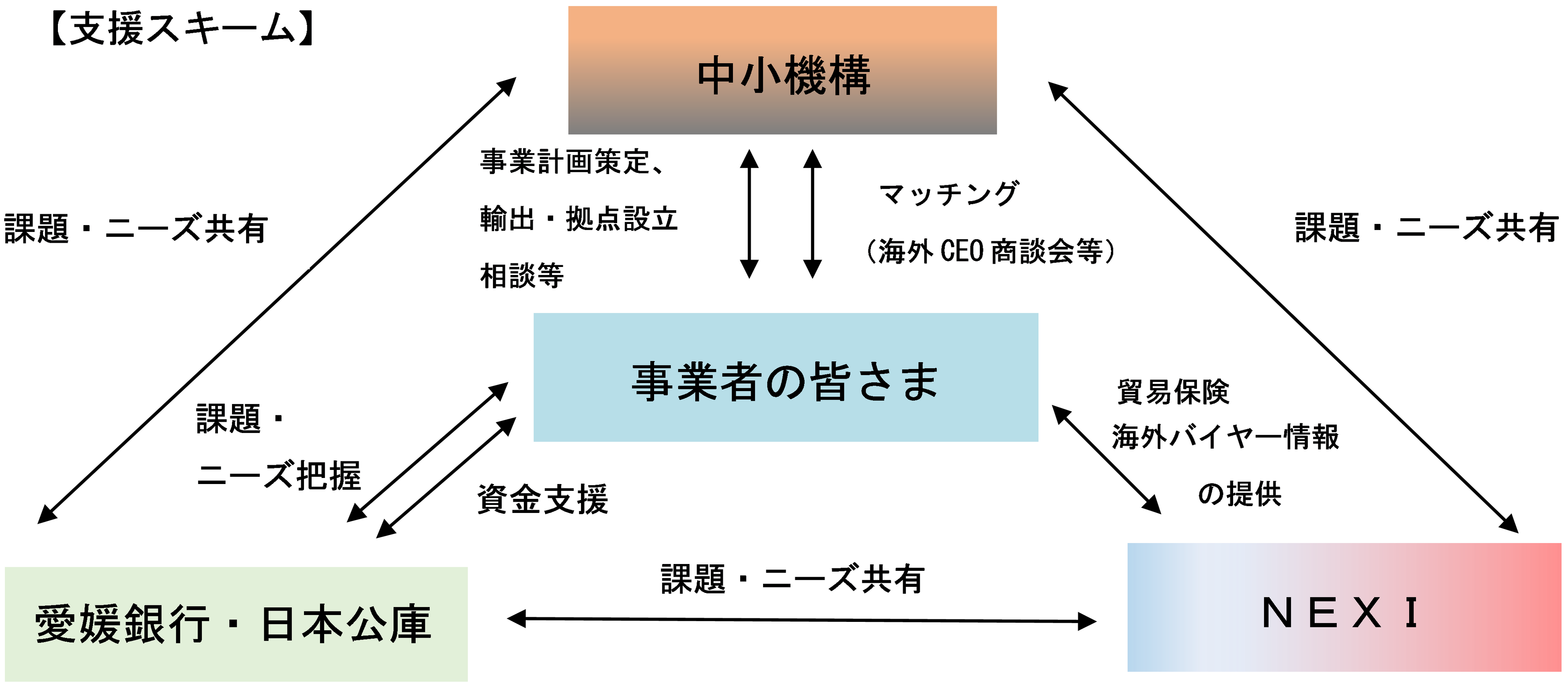 「海外ビジネス支援パッケージ」(以下「本スキーム」)は、海外への販路開拓・拡大等を図るうえでの様々な課題に対する解決支援を行い、円滑な海外展開の実現につなげるため、中小機構、日本公庫及びNEXIが令和4年12月に構築したもので、この度、本スキームに愛媛銀行が参加することになりました。
