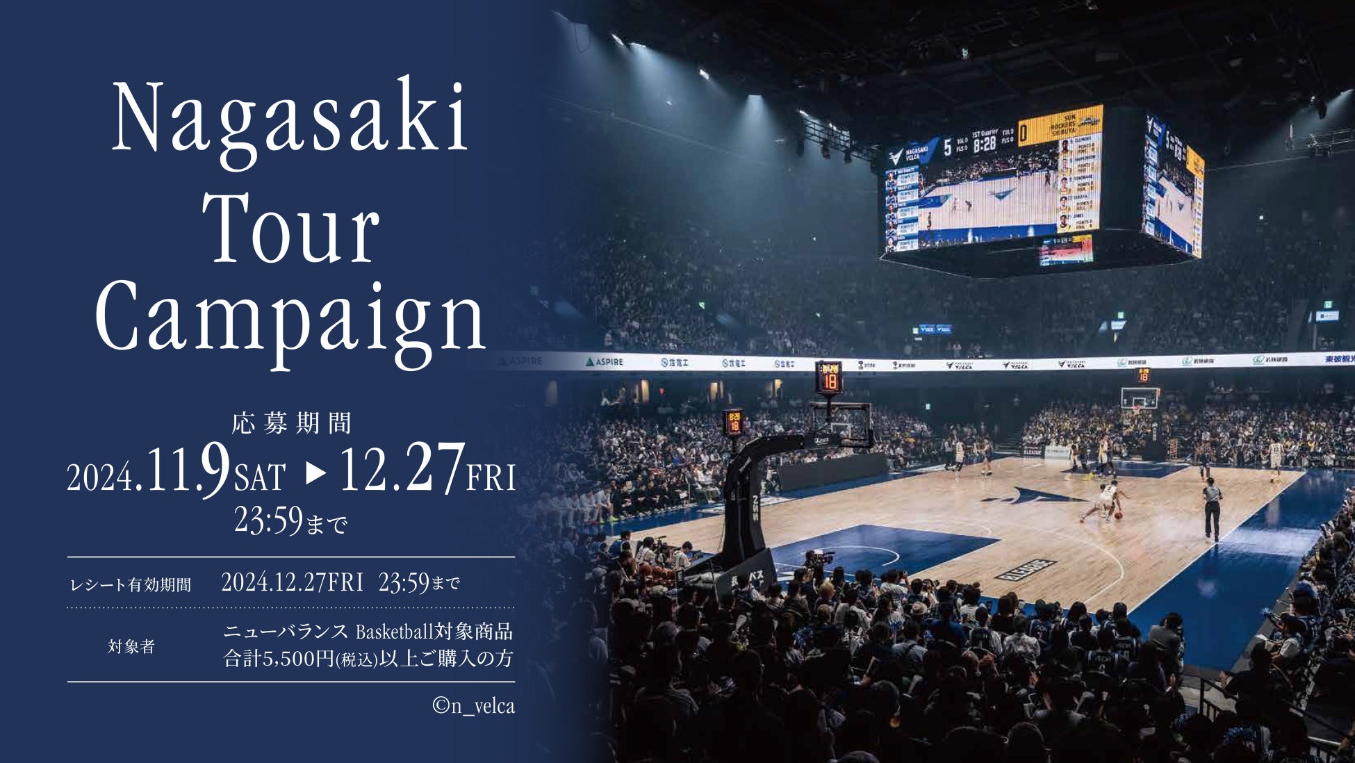 ニューバランス Basketball対象商品を、合計5,500円(税込)以上ご購入の方に、抽選にて長崎ヴェルカの試合観戦と長崎旅行1泊2日ツアーが抽選で10組20名様に当たるキャンペーンとなります。