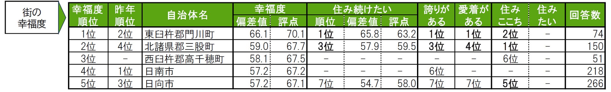 街の幸福度は、1位東臼杵郡門川町、2位北諸県郡三股町。3位は初登場の西臼杵郡高千穂町。