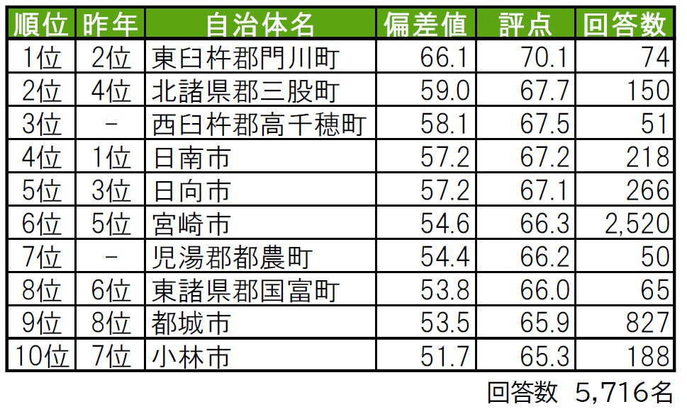 1位は東臼杵郡門川町(昨年2位)、2位は北諸県郡三股町(昨年4位)で、「住みここち」でもトップ2にランクインしている自治体です。3位は初登場の西臼杵郡高千穂町で、昨年は累計回答数が50名未満でランキング集計対象外でした。その他トップ10内では、7位の児湯郡都農町も、昨年は累計回答数が50名未満でランキング集計対象外だったため今回初登場です。トップ10のうち、5自治体が郡部に属する「町」です。