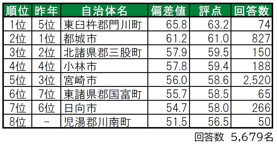 1位は東臼杵郡門川町で、昨年5位から順位を上げました。2位は都城市、3位は北諸県郡三股町です。その他、トップ8内で今回初登場の自治体は8位の児湯郡川南町(こゆぐん かわみなみちょう)で、昨年は累計回答数が50名未満でランキング集計対象外でした。