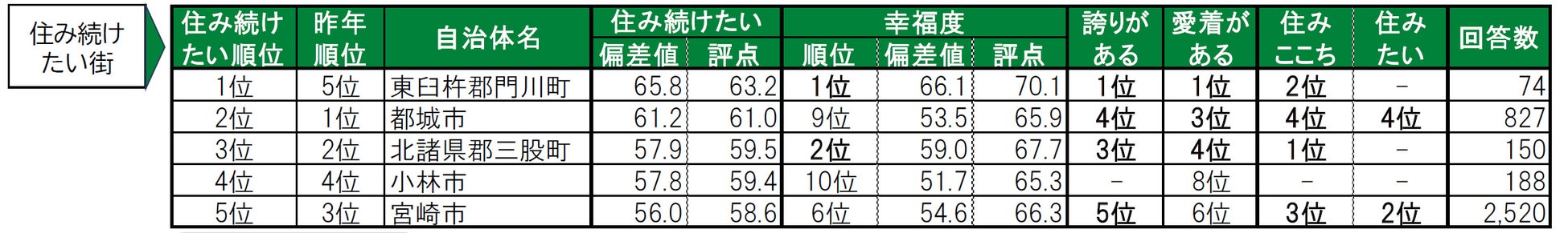 住み続けたい街は、1位東臼杵郡門川町、2位都城市、3位北諸県郡三股町。