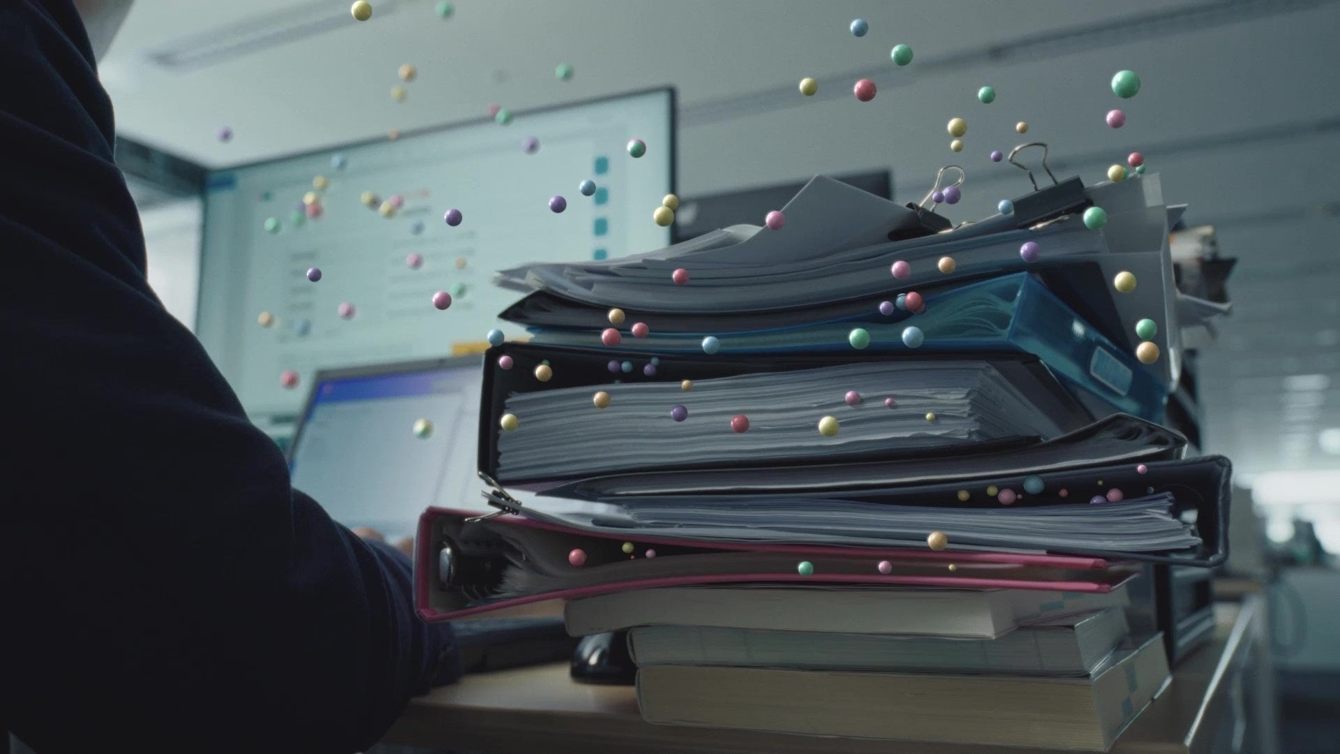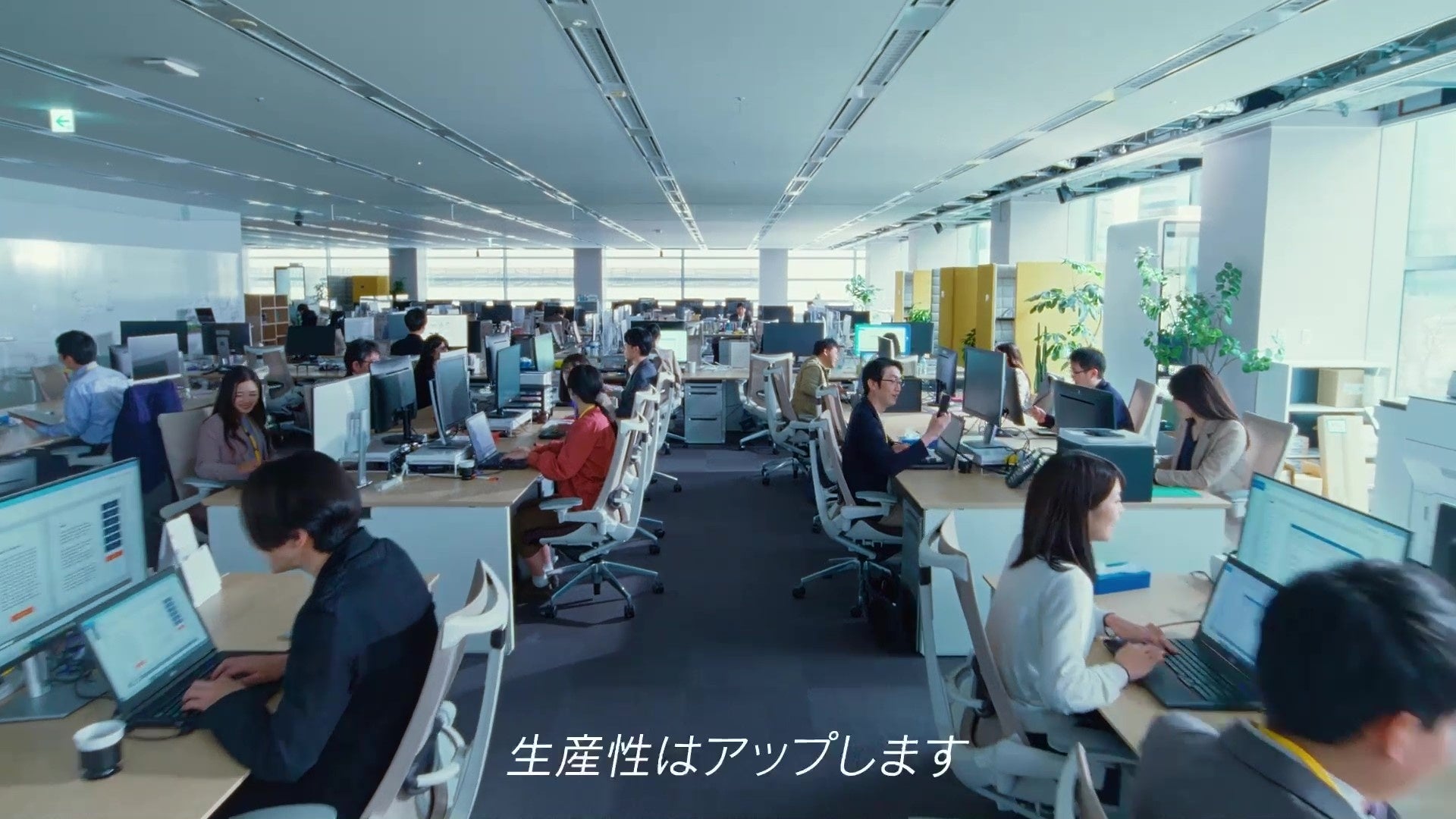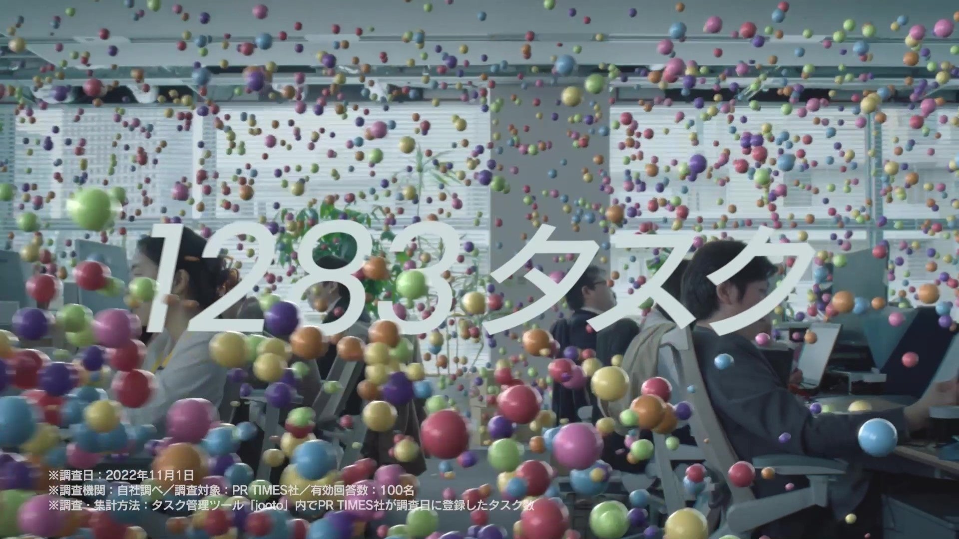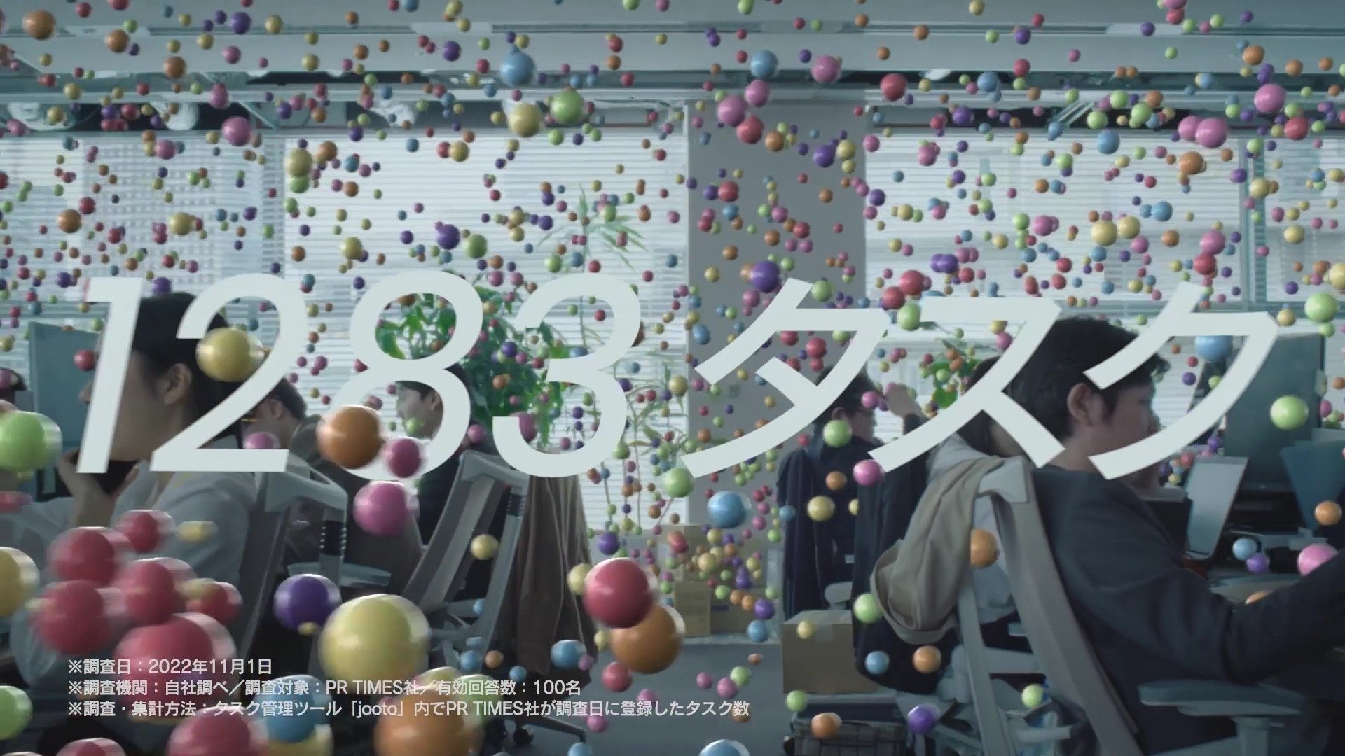 今回のCMは、よくある光景のオフィスが舞台です。デスクには資料が積み上がり、社員がそれぞれの業務に追われ、どんよりとした雰囲気が漂っています。その中にある目に見えないタスク一つひとつが色の粒になって浮かび上がり、やがてそれが渦巻くと、100人が働く企業では1日に計1283ものタスクが生まれている(*)ことが明らかになります。その“カオス”な状況を、Jootoでタスクを整理することで解決に導き、社員が生き生きと働く明るいオフィスに変化する様子を表しました。