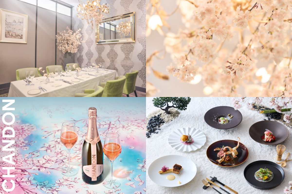 和とフレンチの融合する“フレンチジャポネ”をテーマにしたシェフ特製のコース料理をお楽しみいただけます。また、期間限定で販売する“シャンドンロゼ”はピンクのバラの色調が特徴で、いちごやざくろ、チェリーが奏でる芳醇な味わい。桜の装飾を施された空間で天候に左右されずにお花見をお楽しみいただけます。