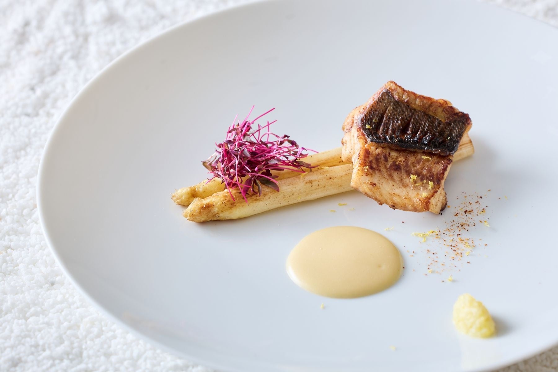 【魚料理】 伊佐木のムニエル ホワイトアスパラガスを添えて 瀬戸内レモンのソース