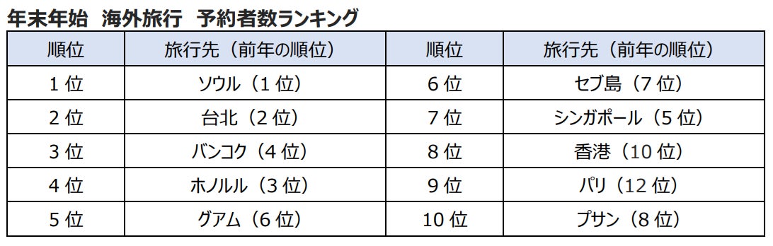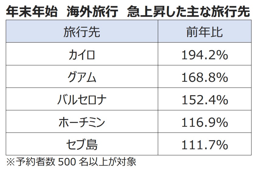 株式会社エイチ・アイ・エス(本社:東京都港区 以下、HIS)は、今年の年末年始(2025年12月26日~2026年1月4日出発)の海外旅行予約状況から、旅行動向について下記のとおりにまとめました。