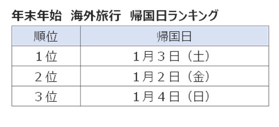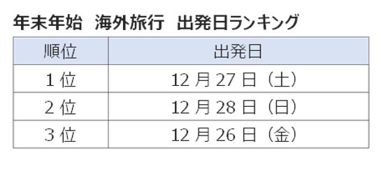 出発日としては12月出発が人気で、全体の50.7%が12月26日(金)~28日(日)の3日間に出発する結果となりました。年末年始における出国ピークは「12月27日(土)」、帰国ピークは「1月3日(土)」です。
