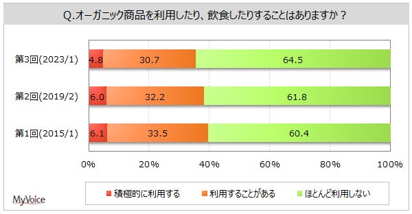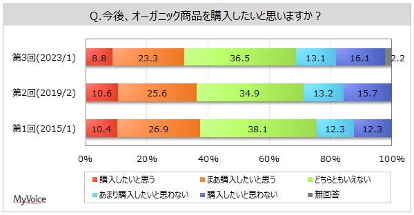 | <今 回>(2023/1)https://myel.myvoice.jp/products/detail.php?product_id=29408 ※上記設問の他に「購入したいオーガニック商品のジャンル」も聞いています。 <第2回>(2019/2)https://myel.myvoice.jp/products/detail.php?product_id=24706 <第1回>(2015/1)https://myel.myvoice.jp/products/detail.php?product_id=19809 |