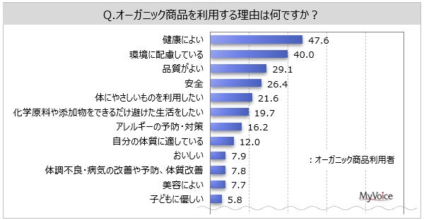 ■オーガニック商品を利用する理由は「健康によい」が利用者の5割弱、「環境に配慮している」が4割、「品質がよい」「安全」が各3割弱