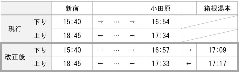 今回のダイヤ改正は、現行ダイヤをベースとしながら、ご利用ニーズの高い平日夜間への特急ロマンスカーの増発や、列車種別ごとの停車駅の見直しによる分かりやすさの向上により利便性を高めます。また、遅れが生じにくいダイヤを目指して、夕方ラッシュ時間帯における駅ホームや快速急行の混雑平準化施策等を実施します。