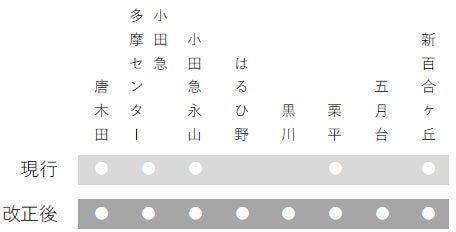 ・小田原線と多摩線を直通する「急行」をすべて 五月台・黒川・はるひ野へ停車し、さらに多摩線内を運行する列車のうち「急行」の割合を大幅に増加することで、新百合ヶ丘での乗り換えが不要になります
