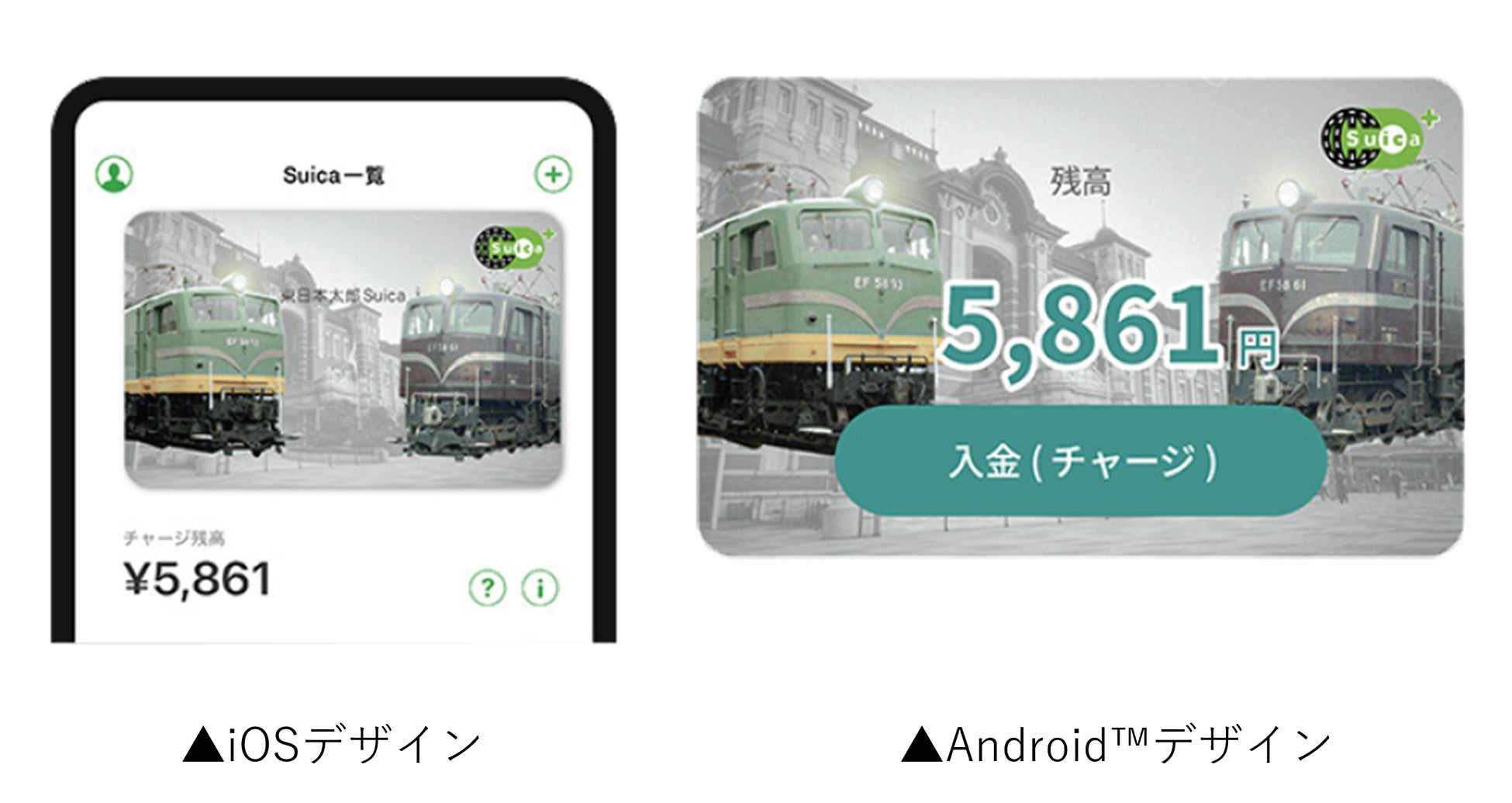 カードフェイスデザインには、「鉄道博物館に所蔵されているEF58 61電気機関車の現役時代の写真と、かつて大宮総合車両センターに所蔵されていたEF58 93電気機関車の写真」、「EF58形電気機関車が発着し活躍した東京駅の丸の内駅舎」をデザインしました。懐かしいEF58形電気機関車をお手元のモバイルSuicaでお楽しみください。