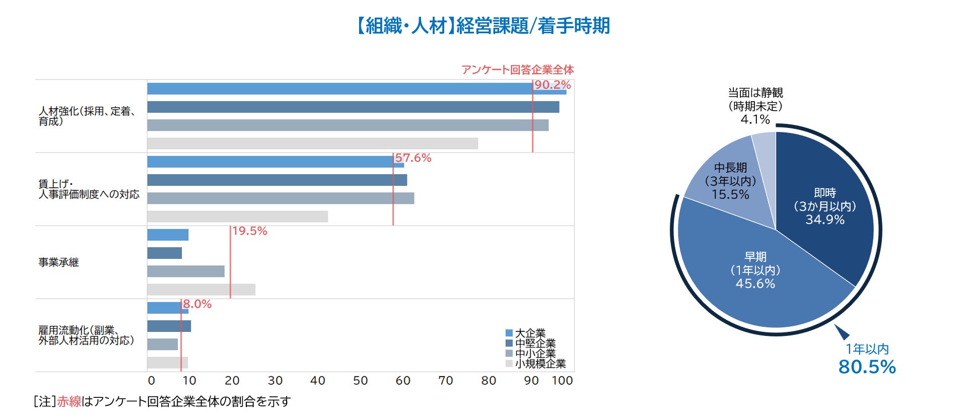 組織や人材に対する課題認識は「着手時期」にも表れている。「即時」と「早期」を合わせた「1年以内」に着手すべきとの回答が80.5%に達し、5つのカテゴリーで最も高かった。人手不足や採用競争の激化、デジタル人材の供給不足など容易には解消できない需給の歪みが広がるなか、企業が最優先で向き合わざるを得ないテーマであることが示唆された。