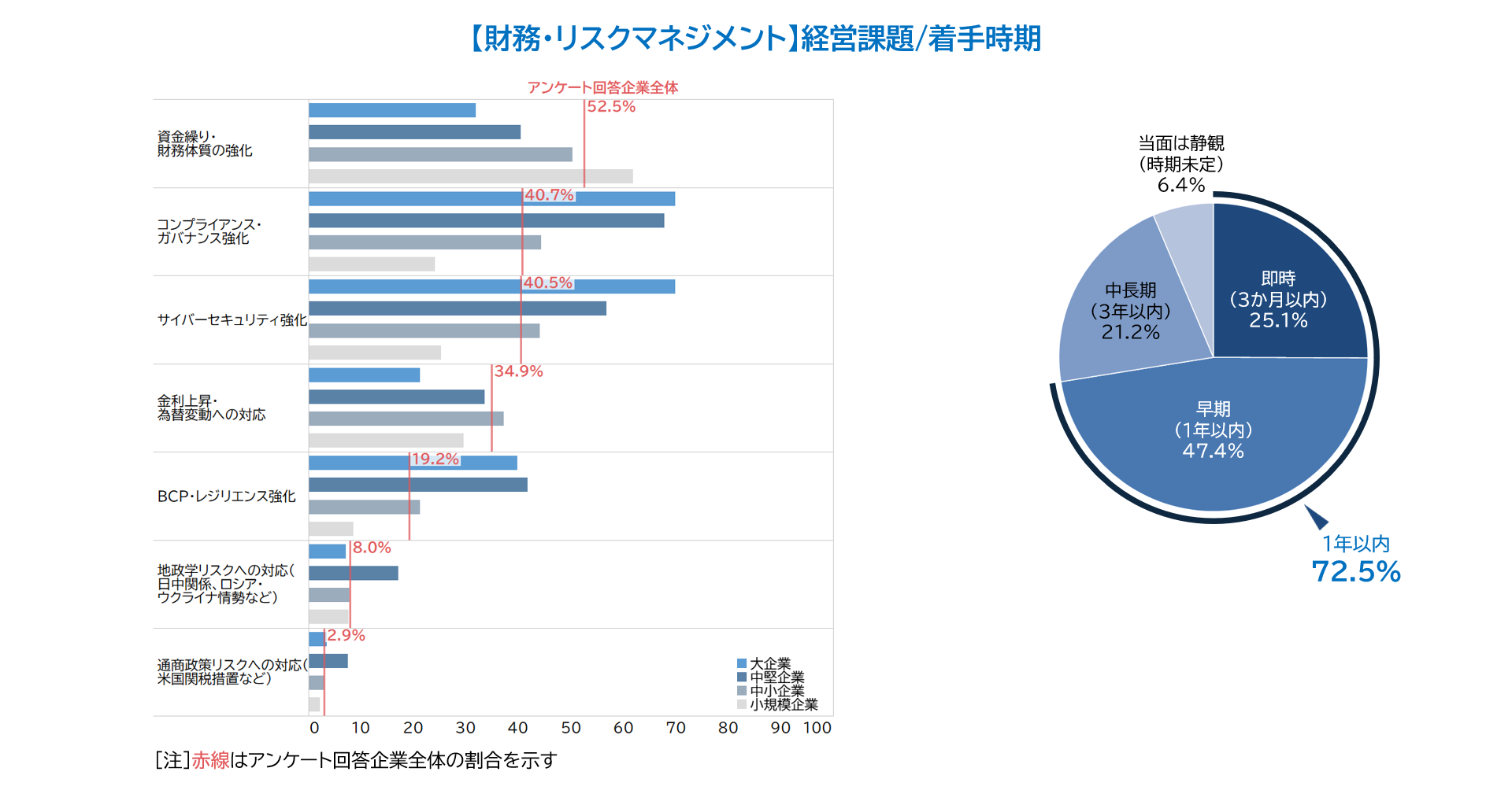 また、経営課題に取り組むうえでの障壁を尋ねたところ、「人材の不足」「ノウハウの欠如」「必要なスキルの不足」が多く挙げられた。社内で対応しきれない領域に、外部専門機関の知見やリソースを活用することは有効な打ち手といえる。規模が大きい企業は、M&AやDX領域、リスクマネジメントといった高度な専門知見を外から取り入れることで施策のスピードと質を高めることができる。先行きが不透明ななかでは、変化に応じて計画を適切に修正し、スピード感をもって実行することが企業の競争力を左右するだろう。