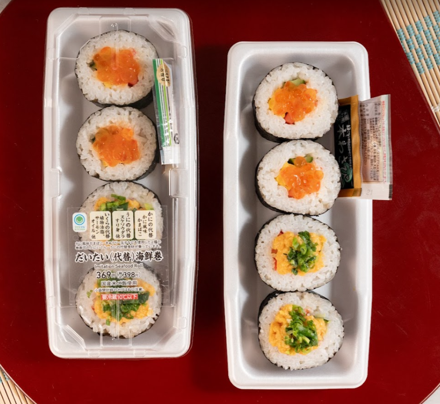 ・カニ風味のかまぼこを使用しています。ウニとイクラの代替食品をのせたそれぞれの巻き寿司で使用してます