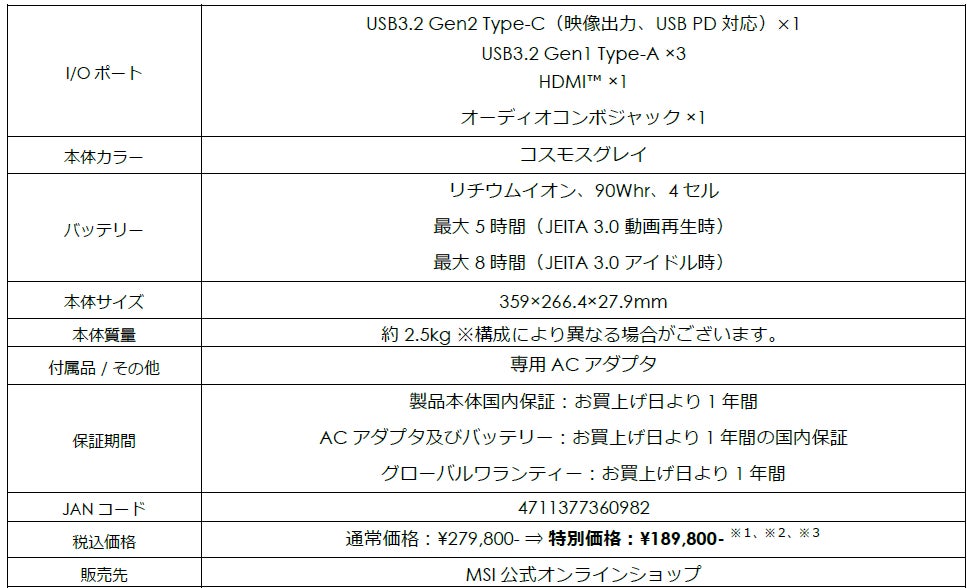 この度、エムエスアイコンピュータージャパン株式会社は2025年10月6日(月)から10月31日(金)まで、キヤノンマーケティングジャパン株式会社が運営するMSI公式オンラインショップ(以下、MSIストア)にて、ハイスペックノートPCなど対象ノートPCが最大25%OFFに加え、スペシャルモデルが通常販売価格から9万円OFFになる『MSIストア 6周年祭 第2弾』(以下、本キャンペーン)を開催いたします。