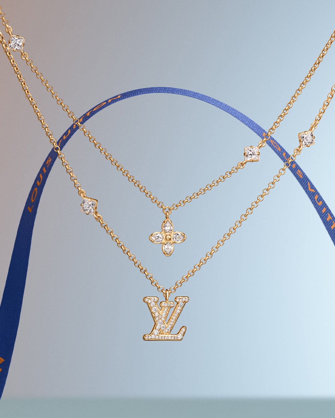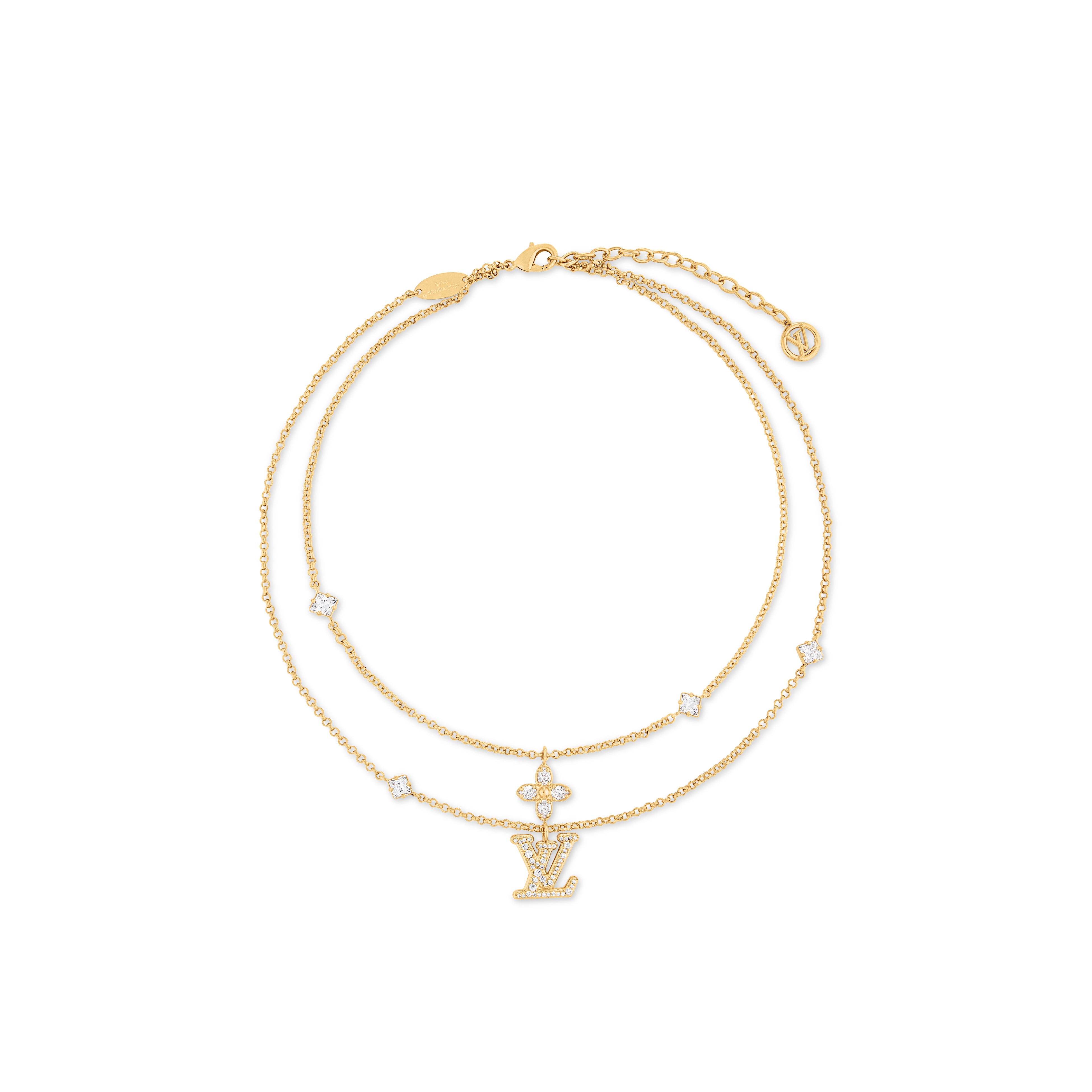 ゴールドカラーのメタルで象った2連のデザインに、きらめくストラスを散りばめた「ネックレス·レディ LV」。2本の繊細なチェーンに、純粋さとフェミニンな慎み深さを象徴するモノグラム·フラワーとLV シグネチャーのチャームをあしらいました。追加された4つのストラスが、ラグジュアリーで洗練された雰囲気にさらなる華やかさを添えます。