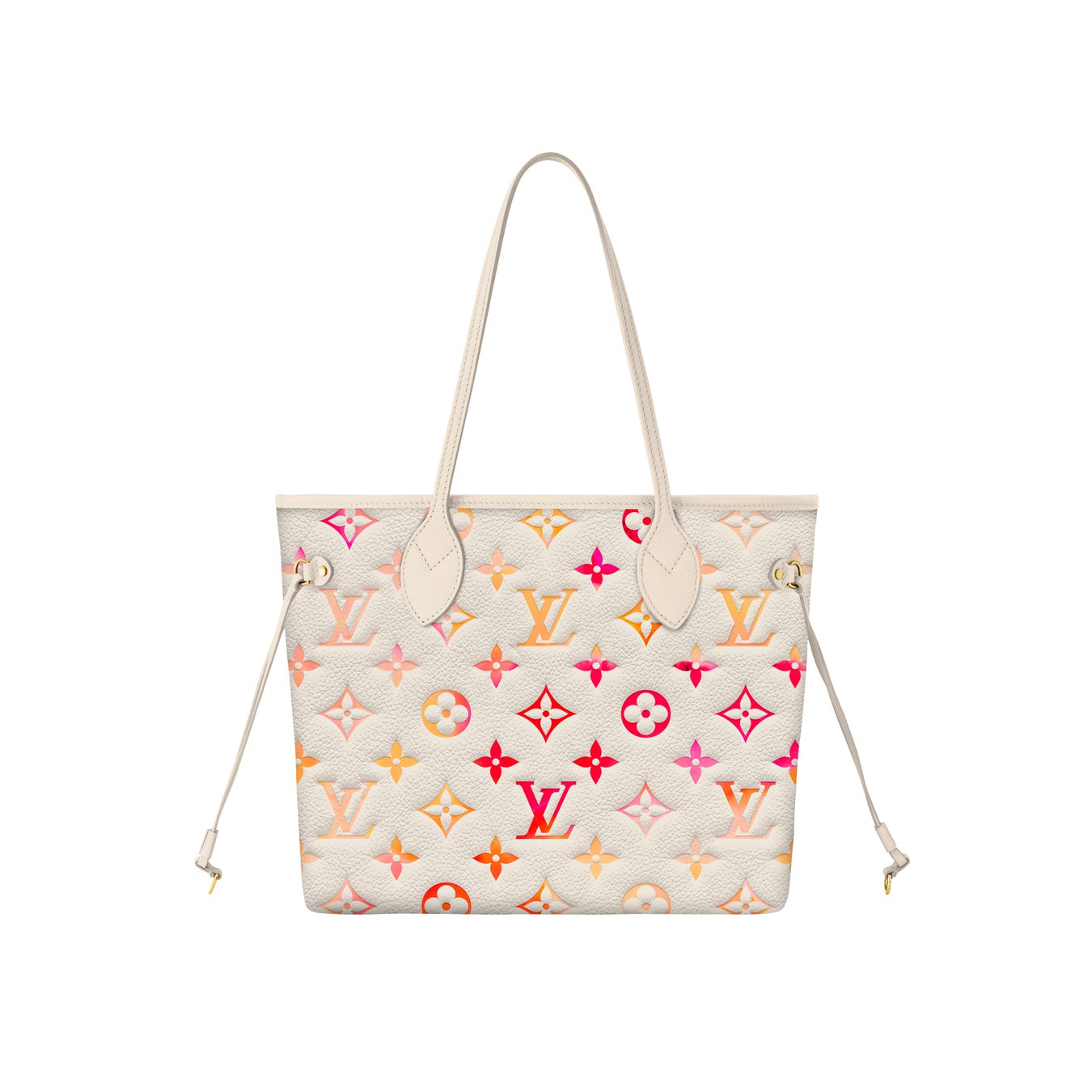 モノグラム·アンプラント レザーを使用した「ネヴァーフル MM」。モノグラムのエンボスの上にプリントされたオレンジとピンク、フューシャカラーの独特のグラデーション加工が陽気な雰囲気をプラス。朝露のようにきらめく、表面にスクリーン·プリントで施したかすかな光沢感が質感を際立たせます。