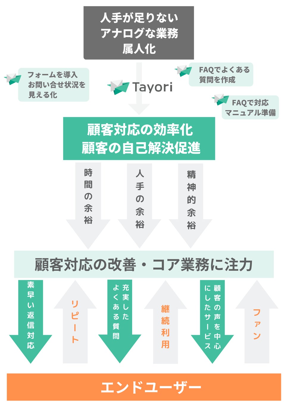 「Tayori」は、カスタマーサポートや顧客対応における「よくある悩み」や課題を解決し、顧客対応業務の効率化をすすめることで生み出された時間的・人的な余裕を使って、コア業務や顧客対応業務の改善に注力できるような環境づくりをサポートします。