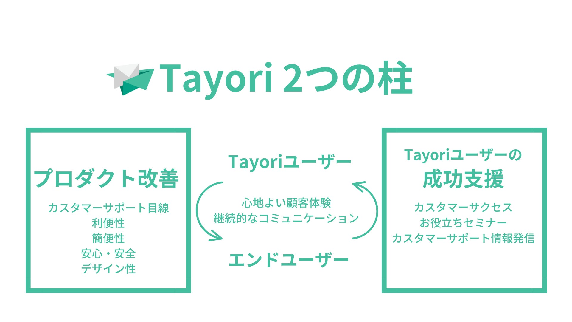 カスタマーサポートや顧客対応における課題解決を通じて、Tayoriユーザーとエンドユーザーの間に継続的コミュニケーションを生む未来の実現のために、私たちは「プロダクト改善」と「Tayoriユーザーの成功支援」の「2つの柱」を中心としてサービス改善を進めてまいります。