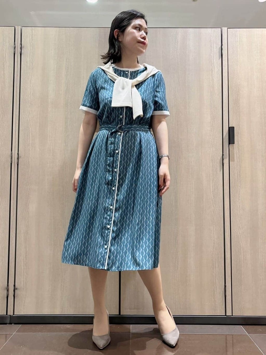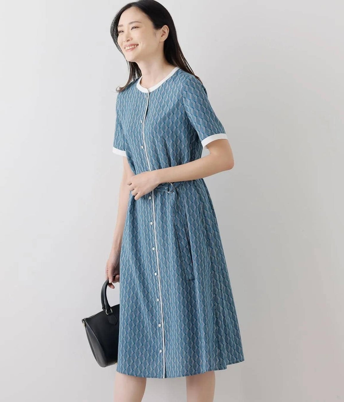 繊細なダイヤモチーフの幾何学柄が目を惹く半袖シャツワンピース。シックで落ち着きがありながらも、白の配色が清涼感を感じさせる春夏らしい1着です。付け外し可能な共布ベルトでシルエットに変化を加えられるのもポイント。