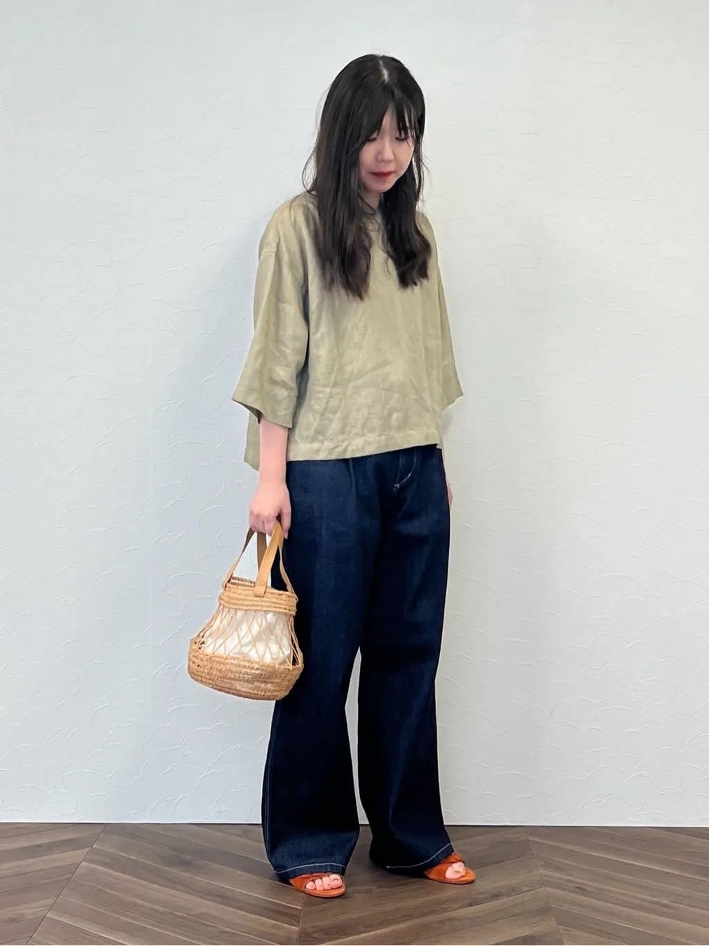 ゆったりとしたサイズ感を活かしたリラクシーな着こなしがおすすめ。ワイドシルエットのデニムと合わせれば、シンプルながらトレンドライクなカジュアルスタイルが完成します。