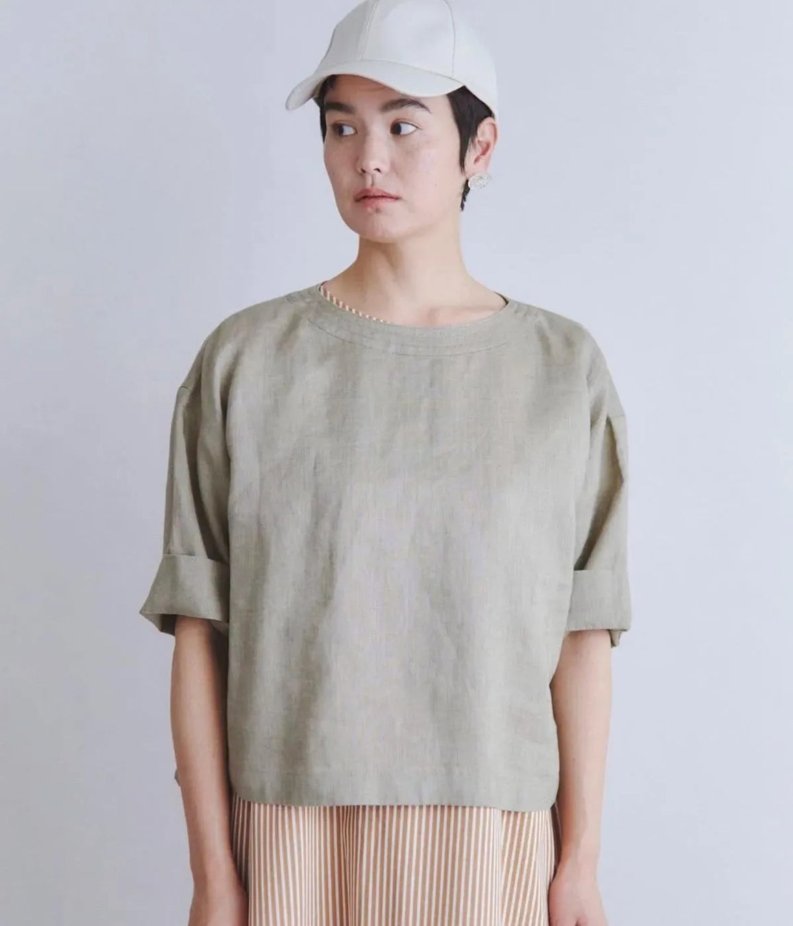 ゆったりとしたシルエットの6分袖ブラウス。生地の表面だけを染めた、独特な陰影が特徴のリネンを使用しています。風通しの良いリラクシングなシルエットに、生地の風合いも相まって、涼しげな印象に導いてくれます。