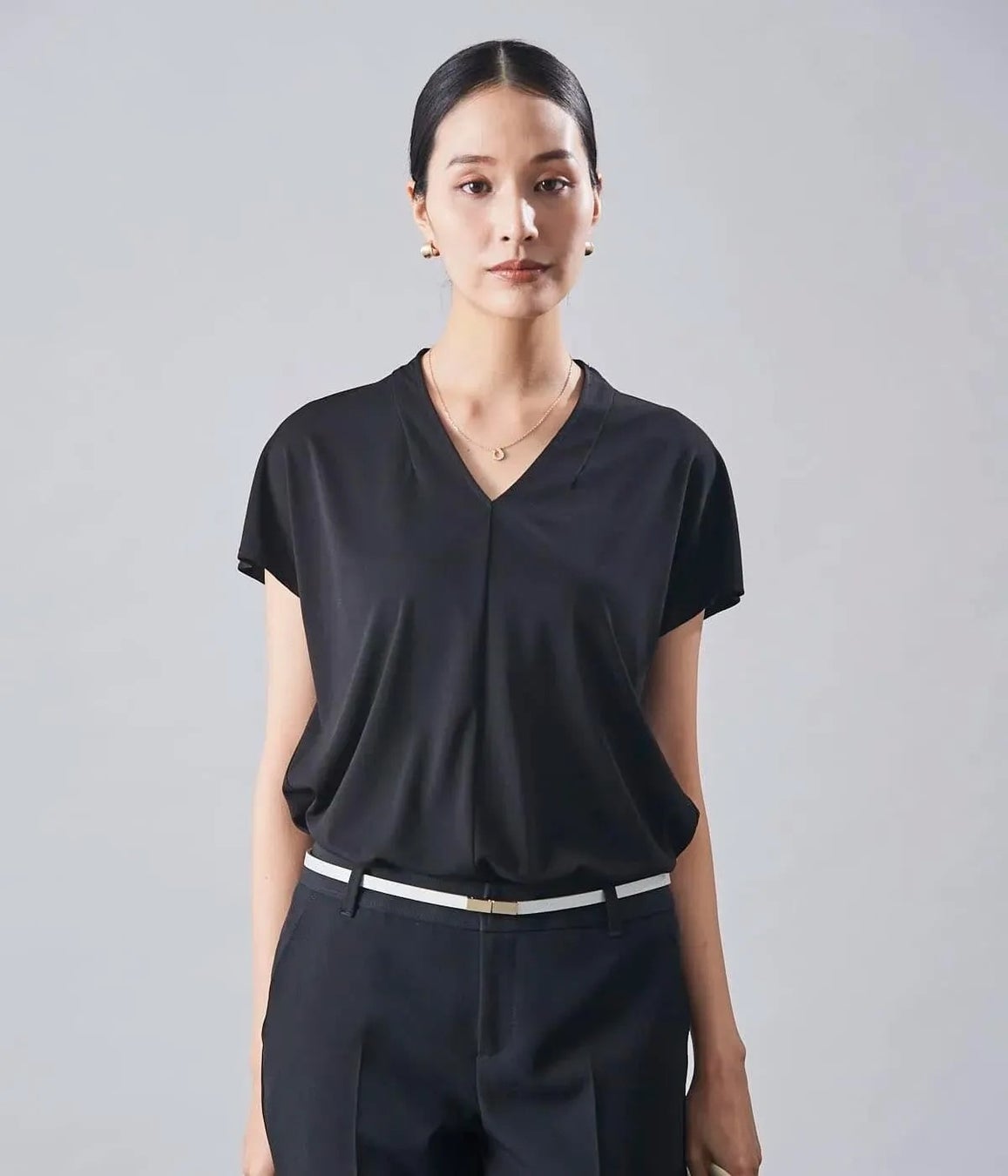 シンプルでコーディネートに取り入れやすいプルオーバーブラウス。デコルテを美しく見せるVネックにタック入りのデザインで、スタイリッシュな着こなしが叶います。さらっとした質感で肌離れが良く、汗ばむ季節も快適にお召しいただけるアイテムです。