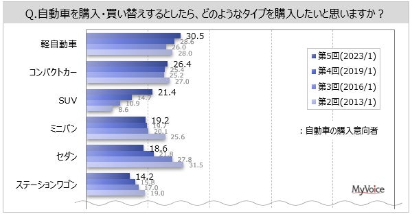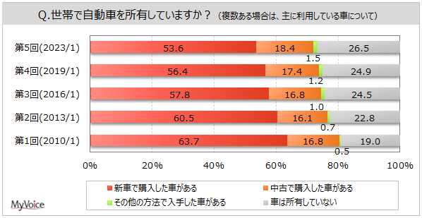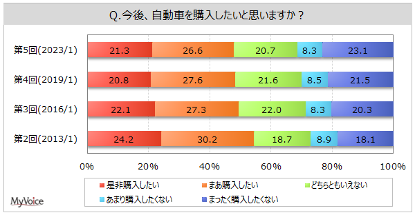 | <今 回>(2023/1)https://myel.myvoice.jp/products/detail.php?product_id=29405 ※上記設問の他に「自動車の所有期間」「自動車購入時の決定権」も聞いています。 <第4回>(2019/1)https://myel.myvoice.jp/products/detail.php?product_id=24605 <第3回>(2016/1)https://myel.myvoice.jp/products/detail.php?product_id=21007 |