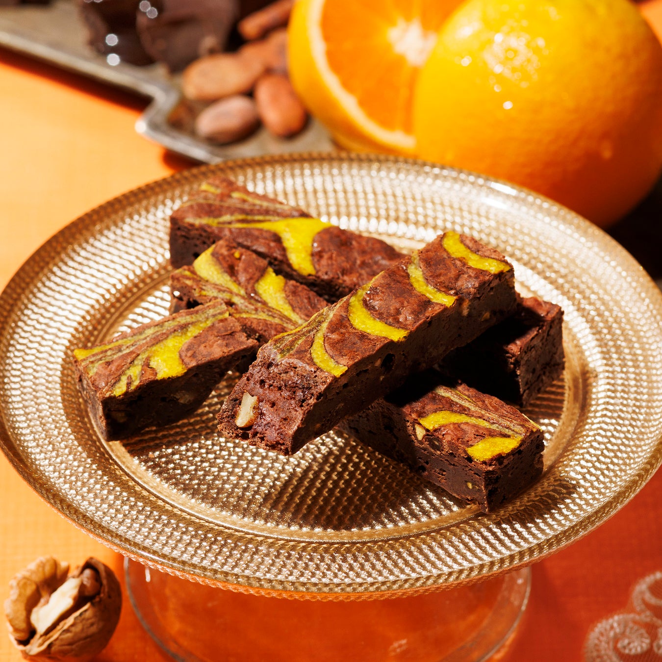 バレンシアオレンジの密漬けしたピールと湘南ゴールドのジャムを生地に練り込んだ、爽やかなオレンジの香りがチョコレートの濃厚な味わいを引き立たせた期間限定のブラウニー。苦味と酸味のあるピールでチョコレートの甘さが強調され、調和のとれた味わいです。爽やかなオレンジの香りとともにお楽しみください。