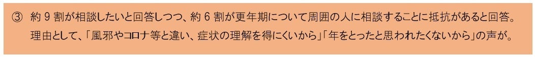 その理由として、「風邪やコロナ等と違い、症状の理解を得にくいから」「更年期症状を経験した人でないと理解できないと思うから」「言われても困るのではないかと不安に感じる」「人によって症状が様々だし、年をとったと思われたくないから」といった声が多い結果でした。