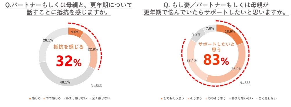 40代から50代女性と同居する配偶者や子ども600人に、「更年期について知っていますか」と聞いたところ、94%(566人)が「知っている」と回答しました。ただし、その中で原因や症状など詳しく知っているのは、24%(136人)でした。また、知っていると回答した566人に、「妻もしくは母親と、更年期について話すことに抵抗を感じますか」と聞いたところ、「抵抗がある」と回答した人はわずか32%(180人)と、当事者と家族では、更年期に対して話すことへの抵抗感に大きな差があることが分かりました。