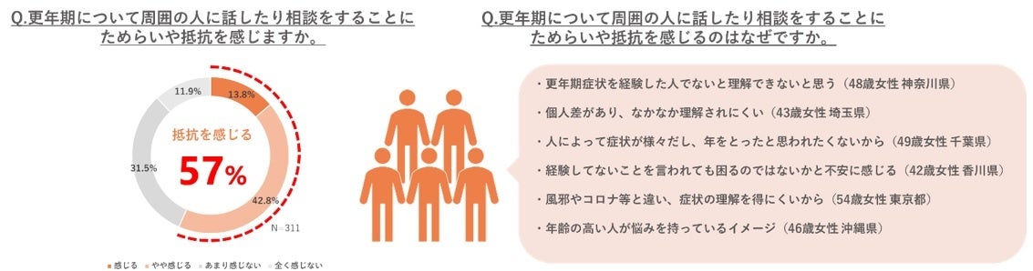 一方、「更年期によって日常の生活に支障を感じる」と回答した人(311人)に、「更年期について周囲の人に話したり相談をすることにためらいや抵抗を感じますか」と聞いたところ、57%(176人)が「更年期について周囲の人に話したり相談したりすることに抵抗がある」と回答しました。
