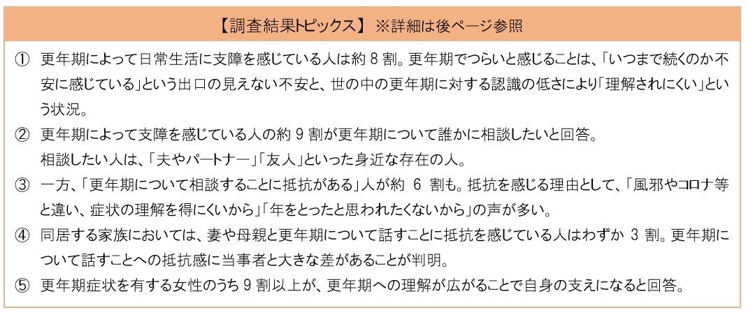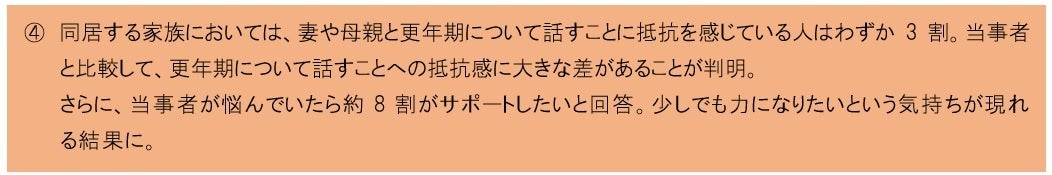 本調査において、現在更年期に悩む当事者とその家族とでは、当事者が家族などに相談したくても、抵抗を感じる反面、大半の家族は抵抗を感じていないということが分かりました。また、更年期に関する理解や意識の差は大きく、当事者は、家族を含め世の中に更年期への理解が広がることを望んでいるという実態も判明しました。