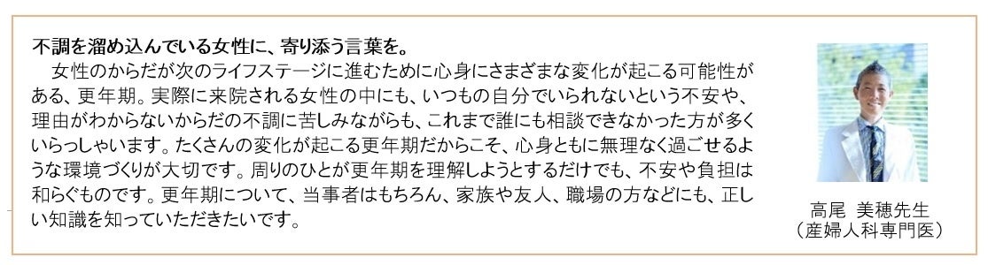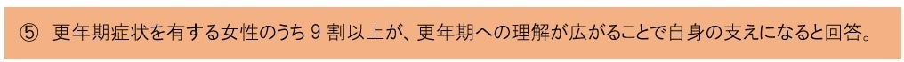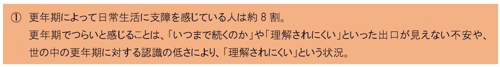 多くの人が「更年期」によって日常の生活に支障を感じており、また、「いつまで続くのかが分からない」といった出口が見えないことや、「体だけでなく、心の不調もあることが理解されにくい」といった、世の中の更年期に対する認識不足が当事者への不安につながっていると考えられます。