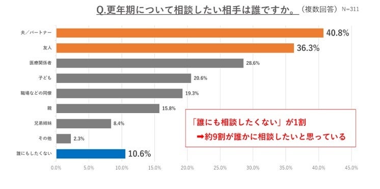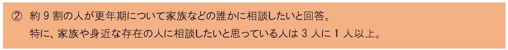 前述の「更年期を通して感じる辛さ」からも、出口が見えない不安や、更年期による心の不調といった目に見えない悩みから、家族をはじめとする身近な人へ相談したいと思う人が多いと推察されます。