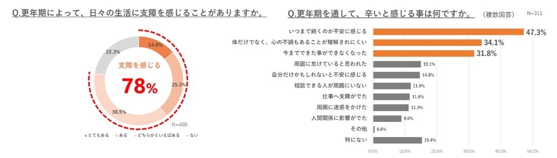 更年期症状を有する40代から50代女性400人に、「更年期によって、日常の生活に支障を感じることがありますか」と聞いたところ、78%(311人)が「更年期によって日常の生活に支障を感じる」と回答しました。そのうち、更年期を通してつらいと感じることとして、「いつまで続くのか不安になる」が47%(147人)と最も多く、「体だけでなく、心の不調もあることが理解されにくい」が34%(106人)、「今までできた事ができなくなった」が32%(99人)と続きました。