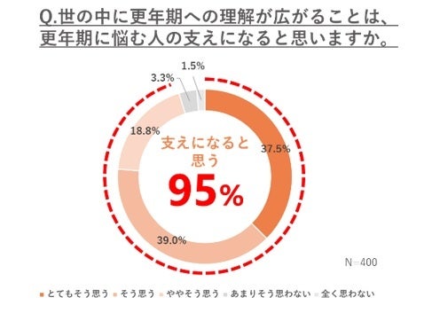 更年期症状を有する40代から50代の女性400人に、「世の中に更年期への理解が広がることは、更年期に悩む人の支えになると思いますか」と聞いたところ、95%(381人)の人が「理解が広がることで支えになる」と回答しました。家族や周囲の人が更年期について理解して相談できる環境を整えることが、更年期で悩む人を支えることにつながると考えられます。
