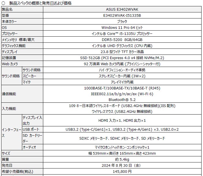 ASUS JAPAN株式会社は、法人向けオールインワンPCを発表しました。作業がしやすい23.8型の大画面ディスプレイと、オフィスや店舗などのどんな場所にもフィットする省スペース設計でスタイリッシュなデザインを兼ね添えた「ASUS E3402WVAK」は、第13世代インテル® Core™ i5プロセッサーを搭載し、妥協のないパフォーマンスを実現します。さらに高速なファイルアクセスが可能なSSDストレージ、Web会議をより快適にするAIノイズキャンセリング機能やWebカメラシールド搭載で、ビジネスにおける生産性が大きく向上します。ASUS E3402WVAKは、本日2024年8月30日(金)より発売を開始します。