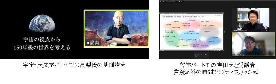 プログラム例 | 2日間の分散型オンライン研修にて、高梨准教授、吉田講師による宇宙・天文学、哲学の講義、グループディスカッションによるアウトプット作成等 |