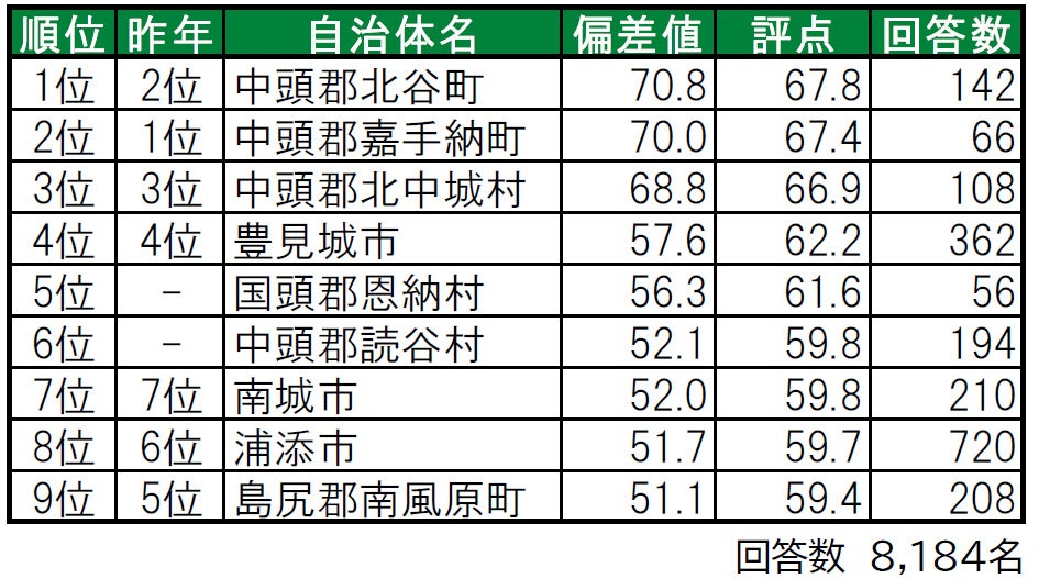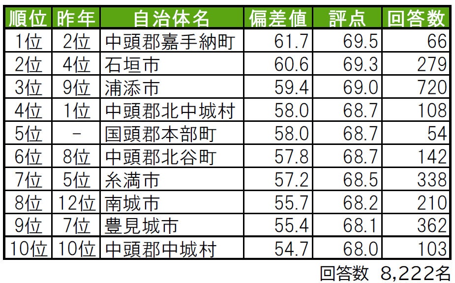 トップ3は中頭郡に属する町で、1位は北谷町、2位は嘉手納町、3位は2年連続で北中城村です。その他、今回初登場でトップ9入りしたのは、5位国頭郡恩納村(くにがみぐん おんなそん)で、昨年は累計回答者数が50名未満でランキングの集計対象外でした。また昨年から順位を上げてトップ9入りしたのは、6位中頭郡読谷村(よみたんそん)です(昨年は偏差値50未満のため順位非公開)。トップ9のうち、6自治体が郡部に属する「町村」です。