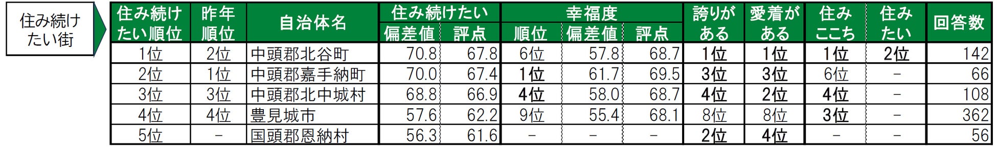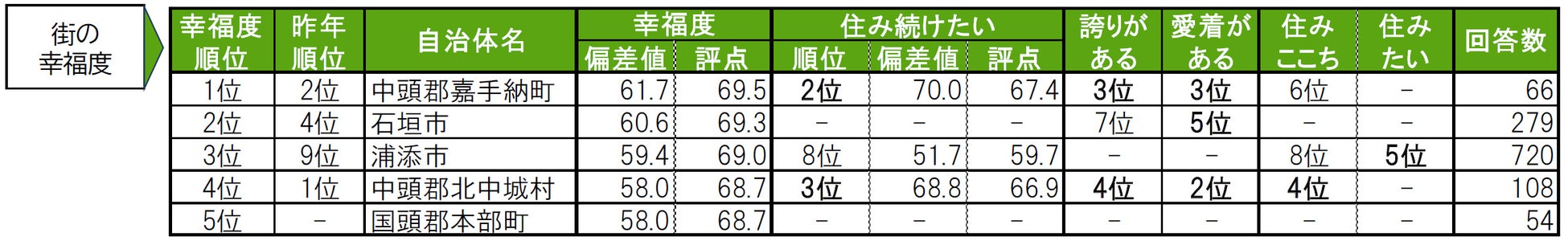 •街の幸福度・住み続けたい街・街に誇りがある・街に愛着があるの順位が「-」と表示されているのは、偏差値50未満のため「-」と表示しています。自治体で50名未満の回答者数で集計の規定に満たない場合、または偏差値50未満の場合、昨年順位を「-」と表示しています。
