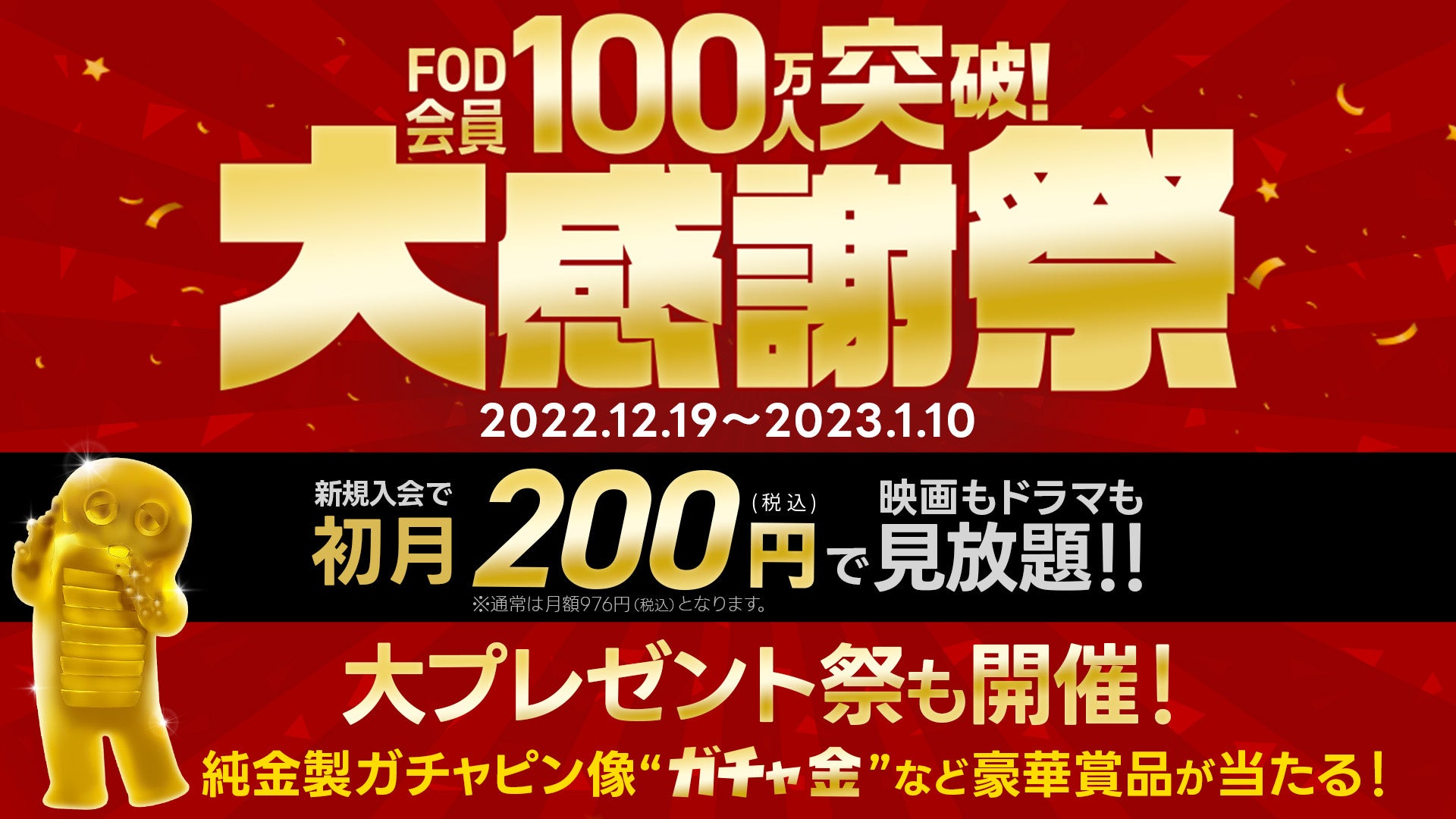 期間中に、『FOD会員100万人突破!大感謝祭』キャンペーン特設WEBサイトまたはFODのWEBサイトのトップページからFODプレミアムに新規ご入会いただくと、通常は月額976円(税込)のところ、登録した月から最初の1ヶ月間が200円(税込)でご利用いただけます。