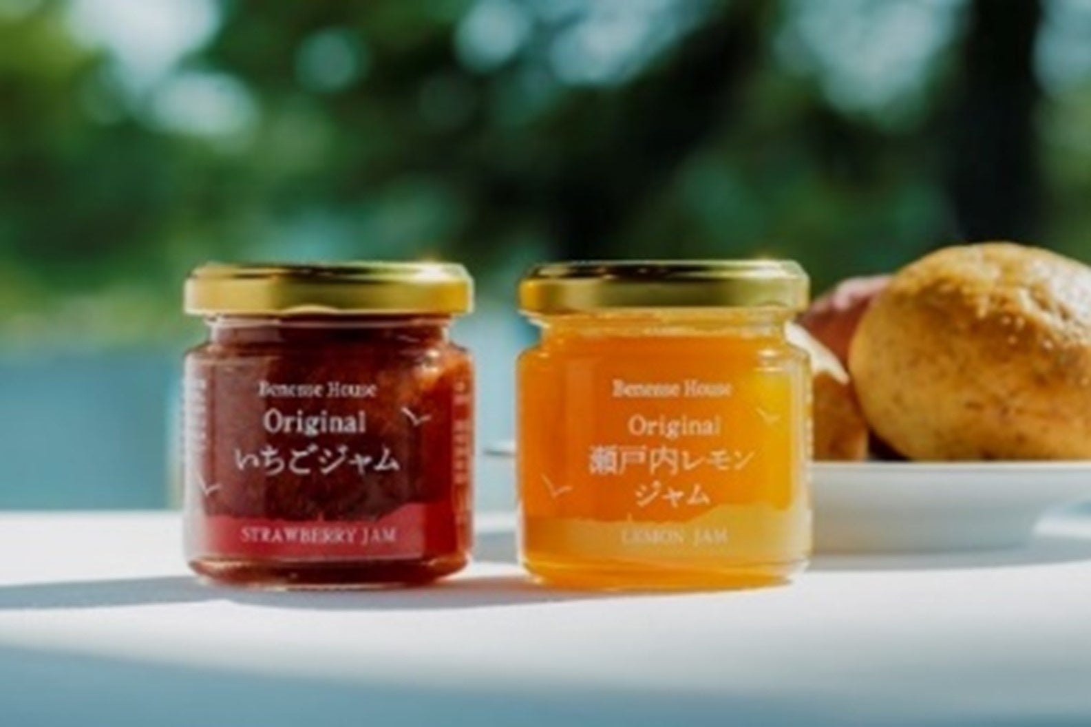 JA香川提供の香川県産レモンを使用した、ベネッセハウスオリジナルレシピのレモンジャムです。内容量の60%をレモン果汁と果肉、レモンピールで占めるほど、たっぷりとレモンを使用しております。砂糖を極力控え、すっきりとした味わいとレモンピールの苦味を楽しむ事が出来る大人が楽しめるジャムです。(写真左のイチゴジャムは収穫次第販売予定です。)