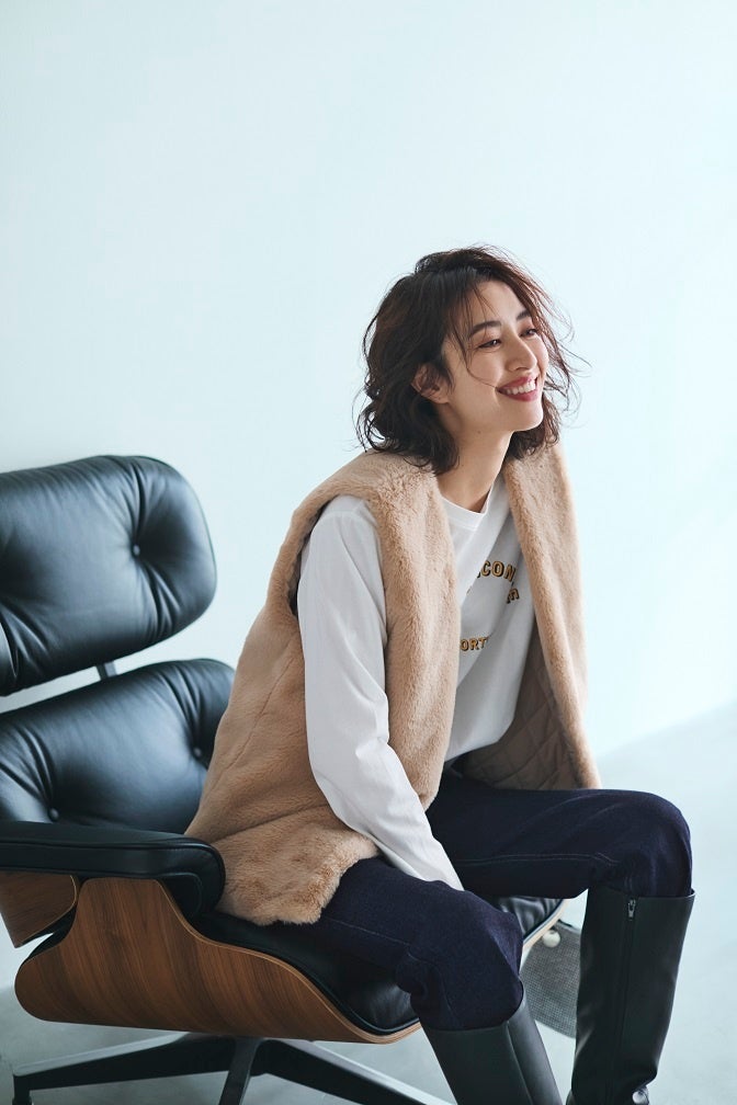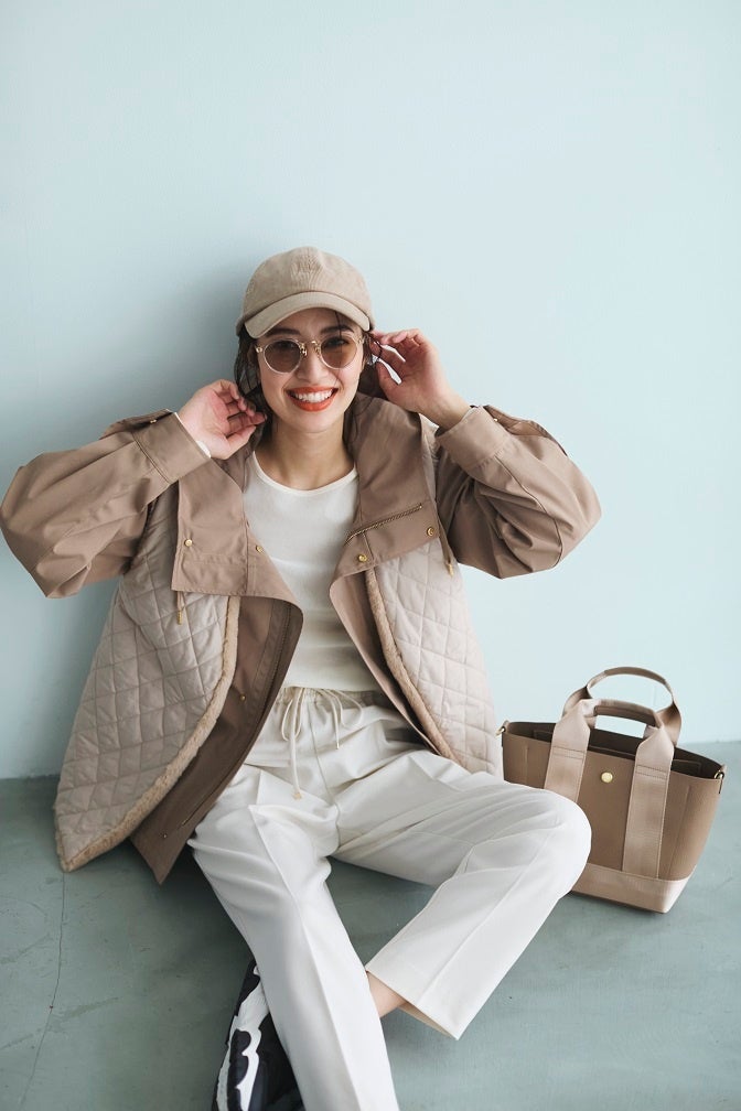 インのリバーシブルフェイクファーベストはやや長めの丈感で、カバー力も抜群。ジャケットよりも長い丈で、裾から見せて着るのが今年らしいバランスです。マウンテンパーカーの上から重ねての着用もおすすめ。中綿入りのキルティングを表にし、両面リバーシブルでの着用も可能です。
