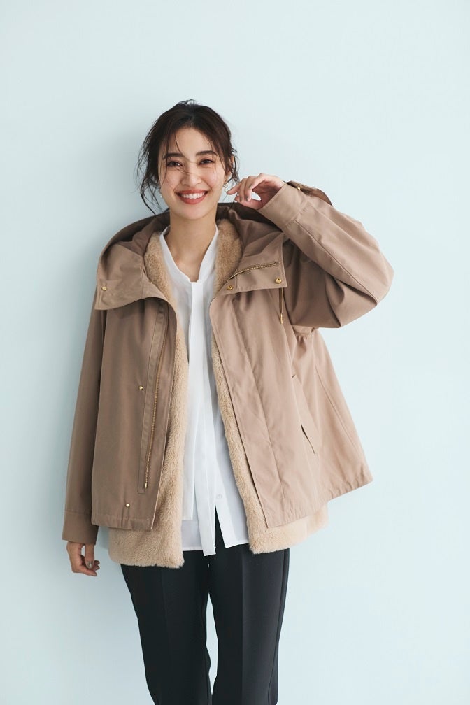 インナーライナーには、きれいめな毛足のフェイクファー、裏面は中綿入りキルティングのリバーシブル仕様。アウターのみ、撥水加工と花粉対応加工を施した機能性付き。スリーシーズンで活躍します。